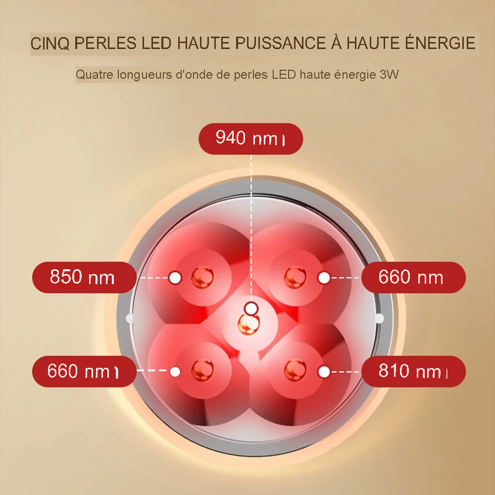 - Longueurs d’onde : 660 nm, 810 nm, 850 nm, 940 nm