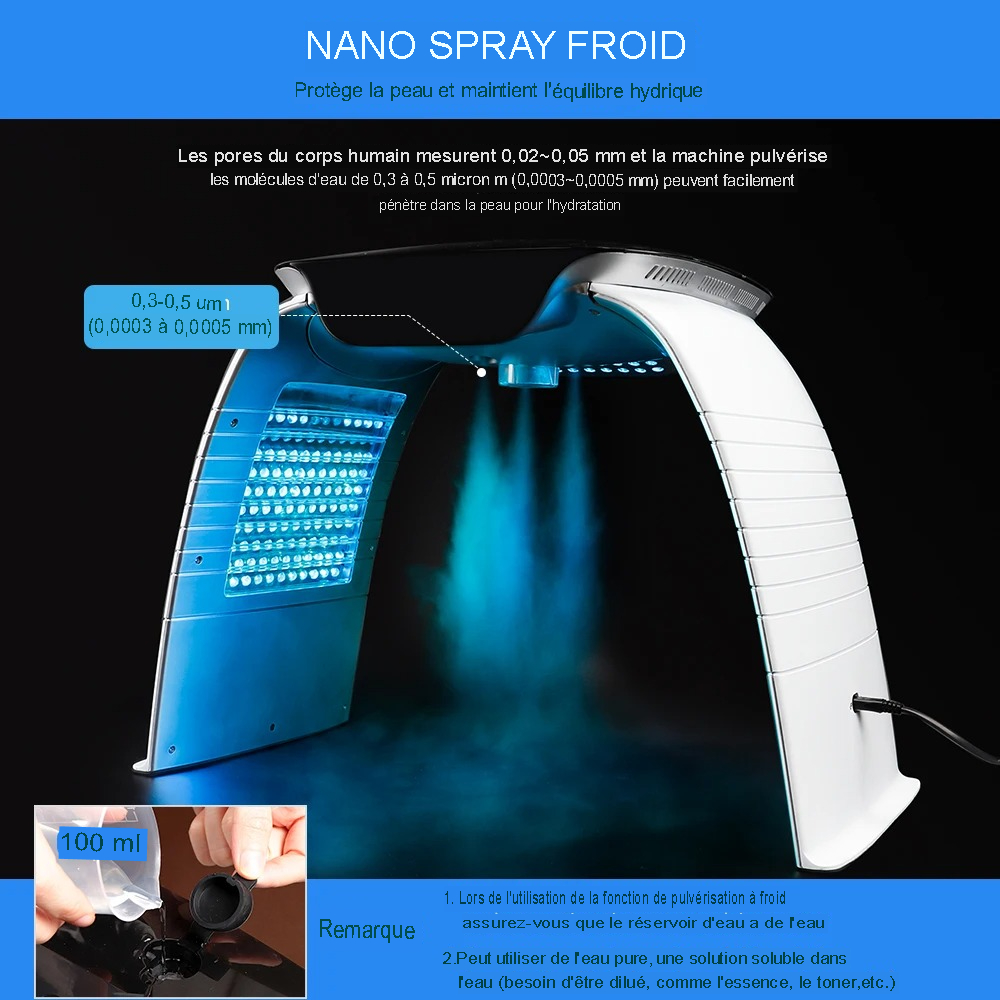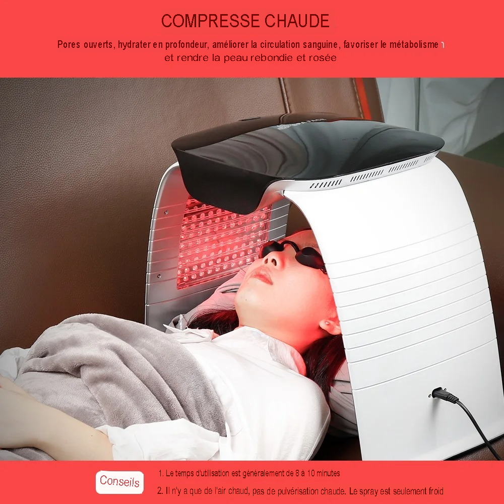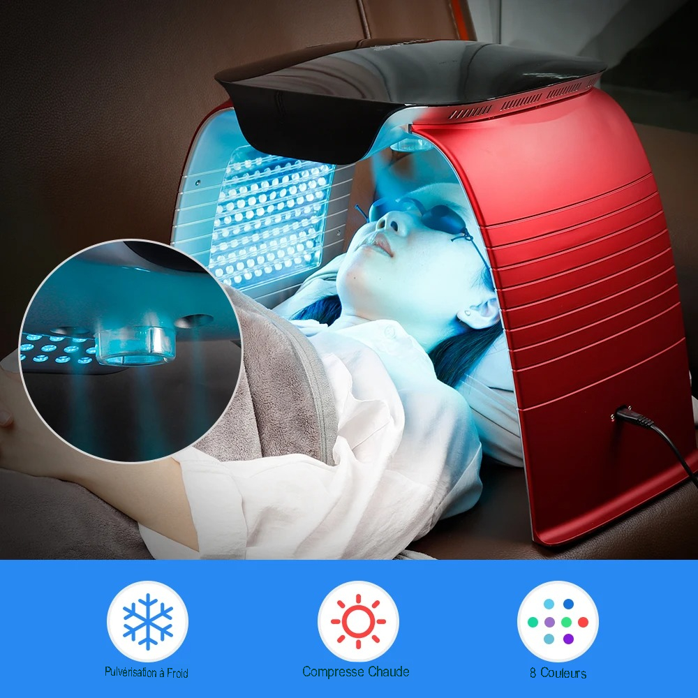 Appareil de soin LED 4-en-1 pour salon de beauté : masque LED 8 couleurs, spray nano froid, compresse chaude hydratante, absorption des UV et du calcium pour un rajeunissement ultime