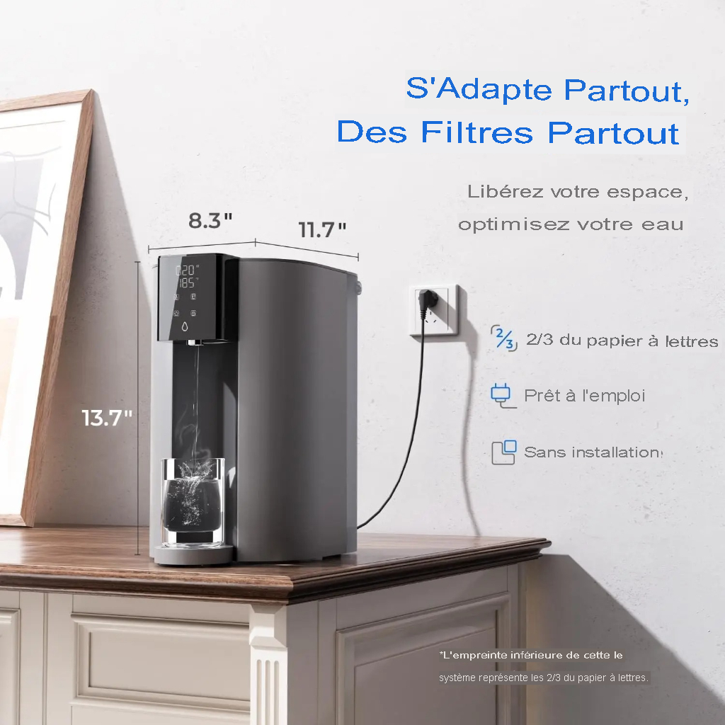 Non seulement la filtration de l’eau par osmose inversé est facile à utiliser, mais elle s’intègre également harmonieusement à votre cuisine avec son design compact. Avec un réservoir d’eau pure portable, profitez d’une hydratation sur mesure, chez vous comme ailleurs.