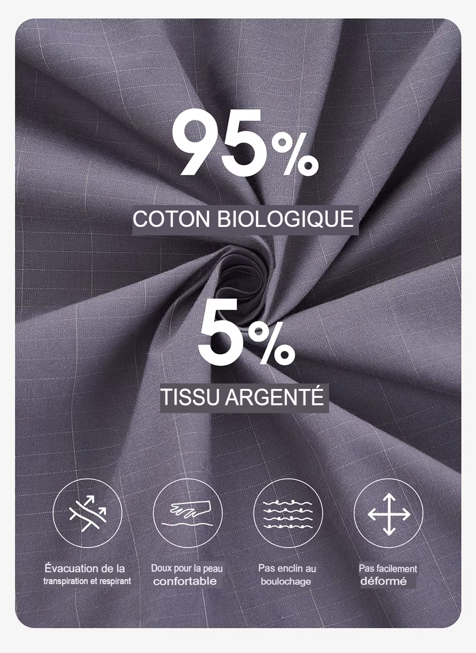 • 95% coton biologique, 5% fil d’argent