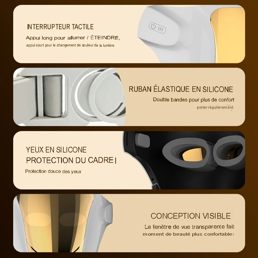 Conçu avec une batterie rechargeable et une interface tactile intuitive, le masque facial LED NIR, thérapie par lumière rouge, respirant, 3 couleurs offre une expérience utilisateur exceptionnelle. La conception respirante et les fenêtres transparences pour les yeux offrent un confort inégalé durant l’utilisation.